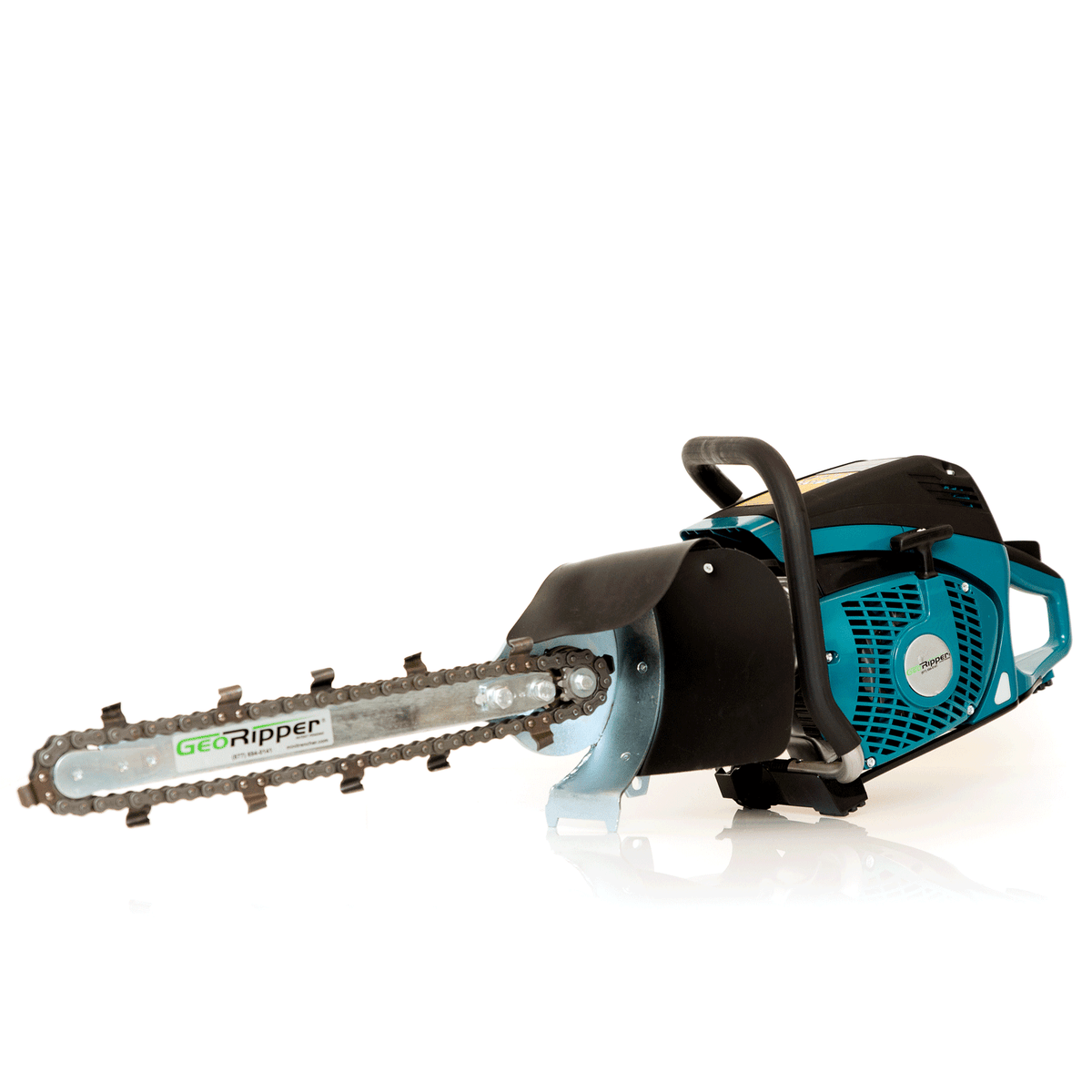 GeoRipper GR20 includes a Makita® EK8100 2-stroke engine (4.4 HP), 20″ digging bar, two self-sharpening digging chains, 18mm combo wrench, spare nose bearing, spare drive belt and owners manual. The GeoRipper GR20 is a commercial, portable handheld trencher used for trenching electrical, irrigation, fiber optic, landscape edging, dog fencing, root barriers, etc.
